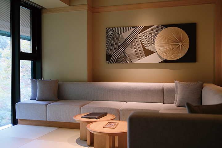 箱根ごこちスイート:2室限定の「箱根ごこちスイート」はリビングにデスクスペースと床が一段下がったソファースペースを備え、滞在空間を点在させることで大人家族もゆったり過ごせる設えです。客室露天風呂からは四季折々の景色を楽しむことができ、専用の湯上り空間「石の間」では、湯涼みのひとときを過ごせます。